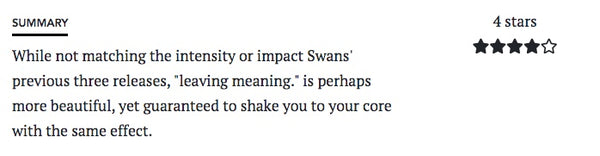 It is decidedly difficult to generate criticism for a band that feels completely severed from popular music standards. It’s also worth noting that the long length of some tracks on “leaving meaning.” will make the record appear inaccessible to large audiences. Gira allows his songs to occupy space and instrumentally bloom to often hypnotic effect, but this approach will not resonate with everybody. In order to fully appreciate its creative vision, Swans asks for your patience. You must test your own mental endurance to listen to the entire album, but the work almost always pays off. While not quite as gratifying as the band’s recent trilogy of albums — “The Seer” (2012), “To Be Kind” (2014) and “The Glowing Man” (2016) — “leaving meaning.” highlights Swans’ incredible attention to detail and ability to create a musical ambience like no other. If you are open to joining Swans on a climb through beauty and brutality, you’ll find “leaving meaning.” to be an extraordinarily rewarding journey.